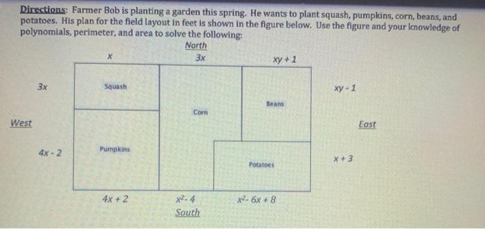 Correct answer to the question Farmer Bob is planting a garden this spring. He wants to plant squash pumpkins corn beans and potatoes. Use the figure and your knowledge of polynomials perimeter and area to solve the following.